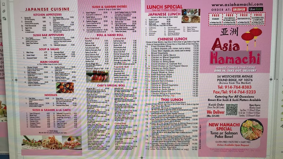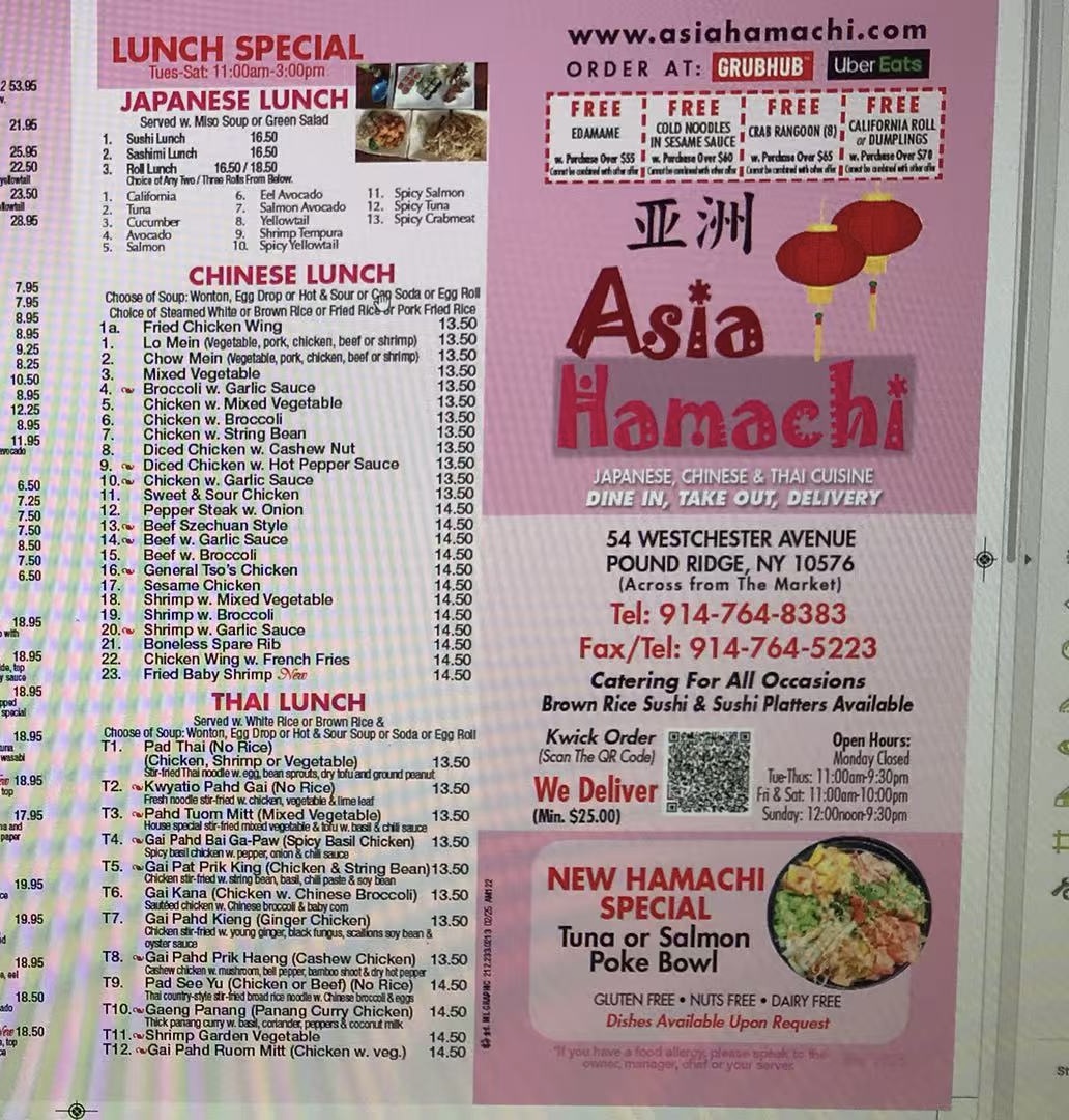 Asia Hamachi Restaurant Menu is the kind that invites you to slow down for a moment and really look at what’s being offered. Tucked along 54 Westchester Ave in Pound Ridge, this spot blends comforting Asian flavors with a few fun surprises, so browsing the menu feels a bit like exploring. You move from fresh sashimi and rolls to warm, savory dishes that are perfect when you want something satisfying, and the transitions between sections feel intentional rather than overwhelming.